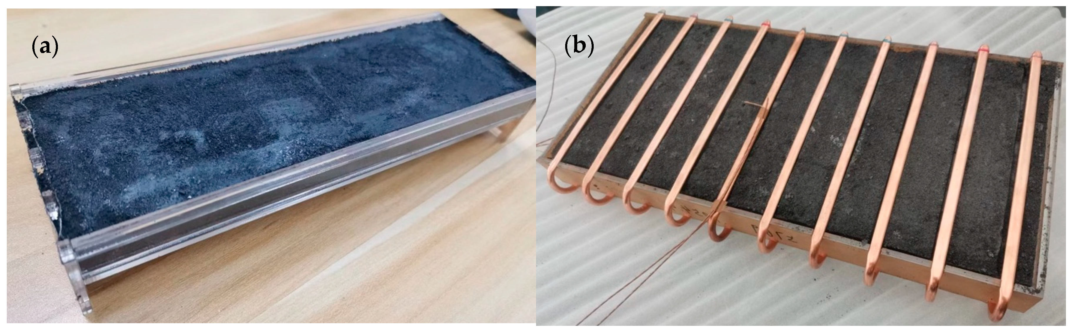Pure paraffin wax suffers from low thermal conductivity and fluidity upon melting, necessitating material modification. This study employs expanded graphite (EG) to enhance the thermal properties of the composite phase change material (PCM) through mechanical stirring and vacuum impregnation methods. The fabrication process of PW/EG composite PCM consists of the following steps: (1) precisely weighing and uniformly mixing 95% paraffin wax with 5% expanded graphite in a container; (2) subjecting the container to vacuum impregnation in a drying oven at 90 °C and −0.1 MPa for 48 h, with intermediate stirring every 6 h; (3) transferring the composite material into acrylic containers while controlling the filling mass to obtain homogeneous PW/EG composite PCM. The modified PW/EG composite PCM effectively addresses the low thermal conductivity of pure paraffin while maintaining shape stability for easier encapsulation. Figure 3 illustrates the final configuration of the PCM integrated with heat pipes for this study, with the corresponding thermophysical properties listed in Table 2. Based on our previous study, the PCM cycling stability could be guaranteed.