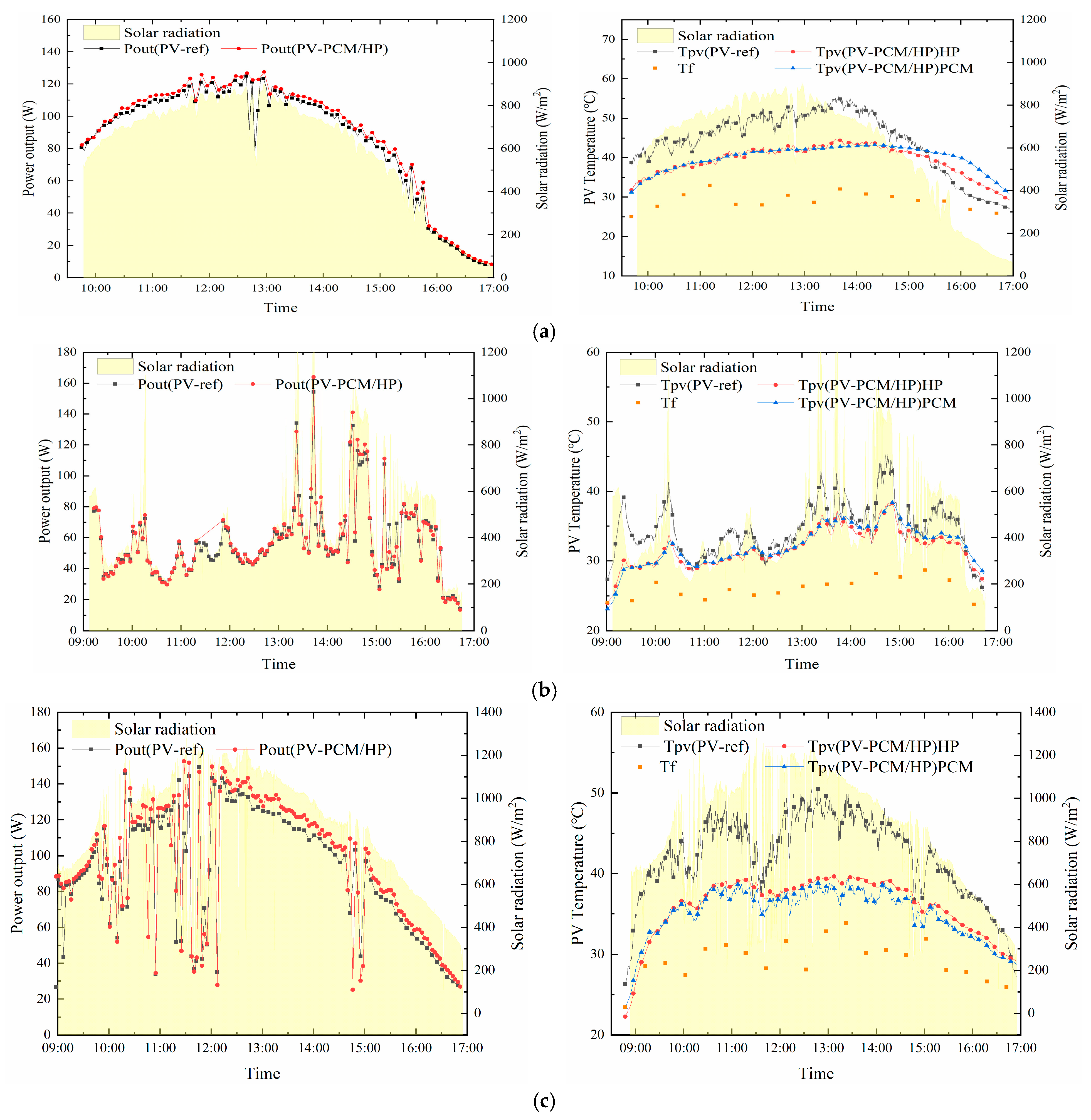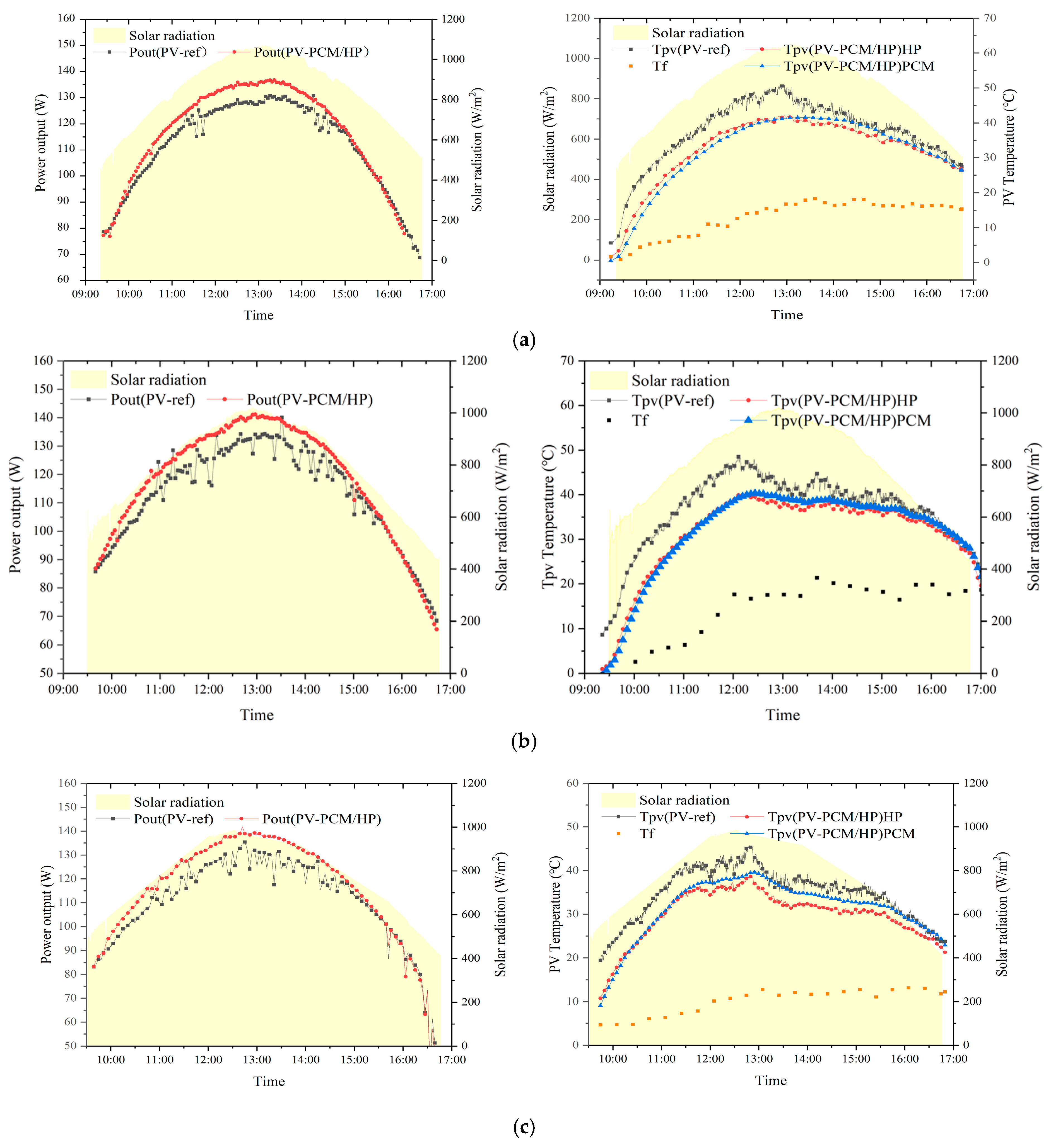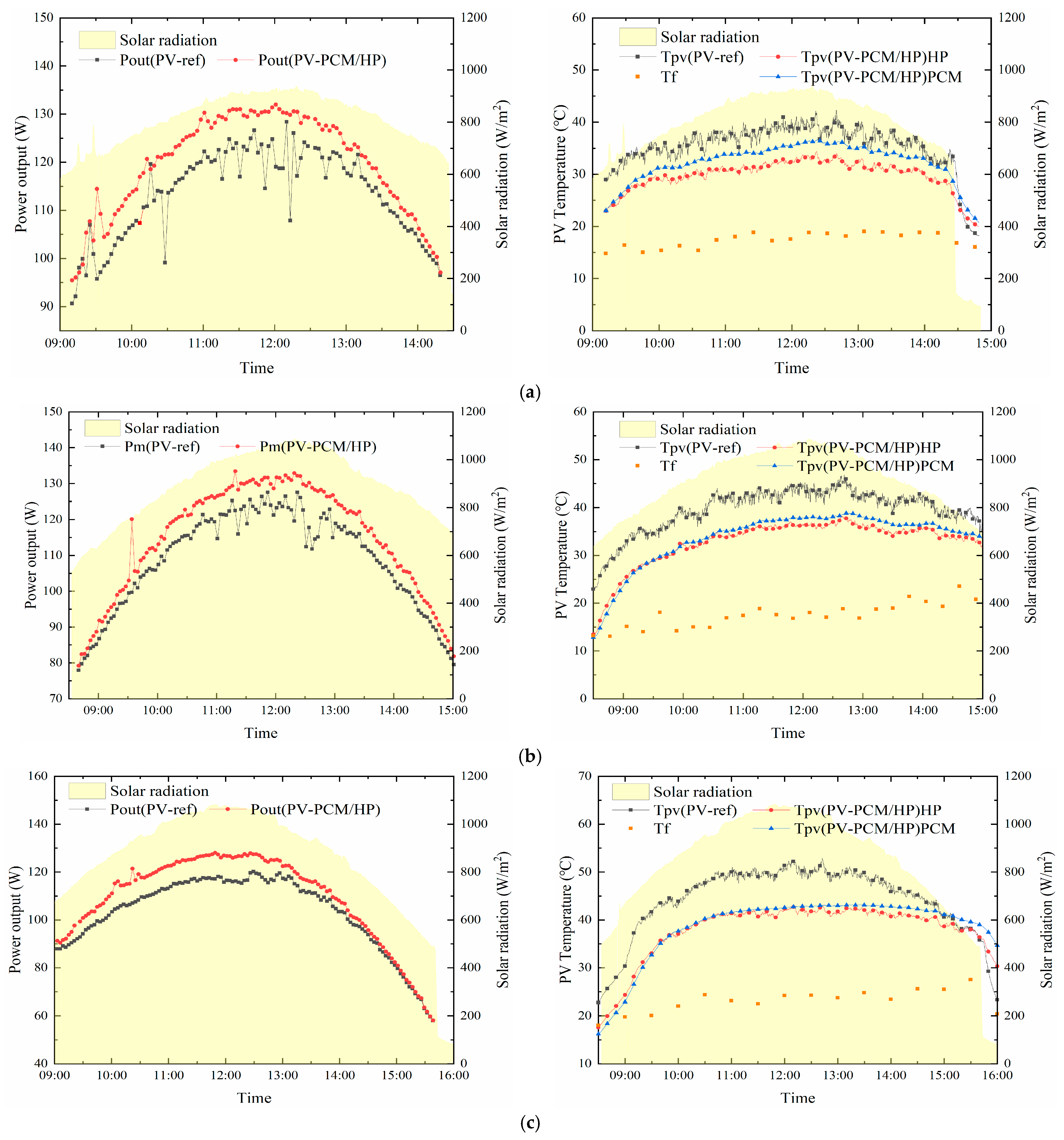 During the test from 9 to 11 October 2022, the average daily solar irradiance in Jinan was concentrated at 800 W/m2, with sufficient light intensity. The air temperature mainly varied between 15 °C and 20 °C, with a small temperature difference between morning and evening. The average wind speed was about 0.5 m/s, which was relatively weak. Other relevant data are shown in Table 7. The temperature changes of PV and PV–PCM/HP are shown in Figure 5. On Day 1, the solar irradiance increased slowly from 9:00 to 12:00, resulting in a relatively gentle increase in the backsheet temperature. A comparison of the data from Day 2 and Day 3 indicates that solar irradiance has a significant impact on the increase in the backsheet temperature. Although the average solar irradiance was similar over the three days, the ambient temperature on Day 3 was significantly higher than that on the other two days, and the average wind speed was lower, leading to a poor convective heat transfer effect of the backsheet and an overall higher backsheet temperature. Meanwhile, both T_(pv(PV-ref)) and T_(pv(PV–PCM/HP)) were basically below 40 °C on Day 1 and Day 2, and a large amount of heat was absorbed by the PCM in the form of sensible heat. Thus, when compared with the data on Day 3, it can be found that the PCM module can better control the backsheet temperature during operation, reducing the maximum temperature difference of the backsheet.
