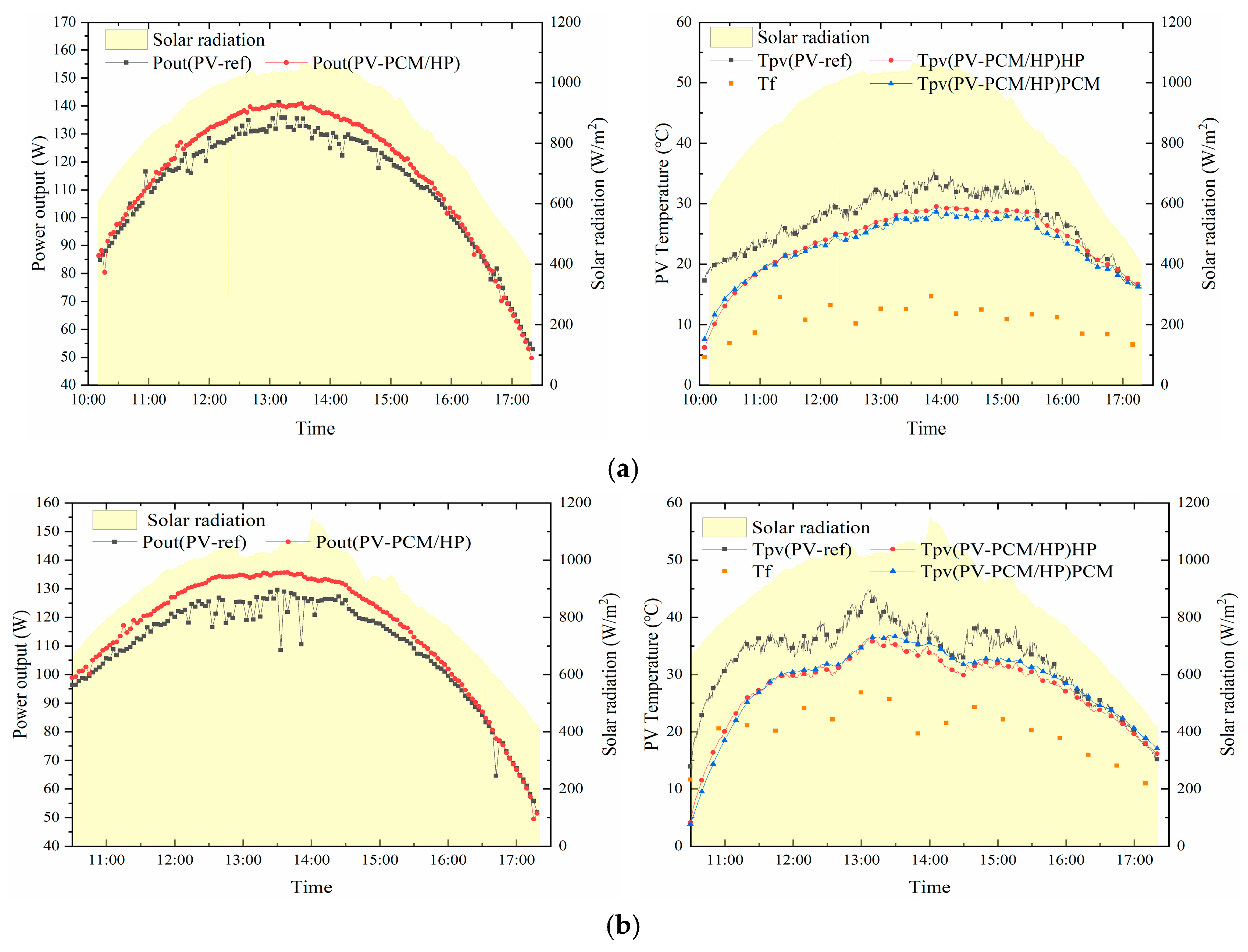 P r e f and P P V P C M / H P represent the power generation of the PV modules and the PV module equipped with the thermal management system, respectively.