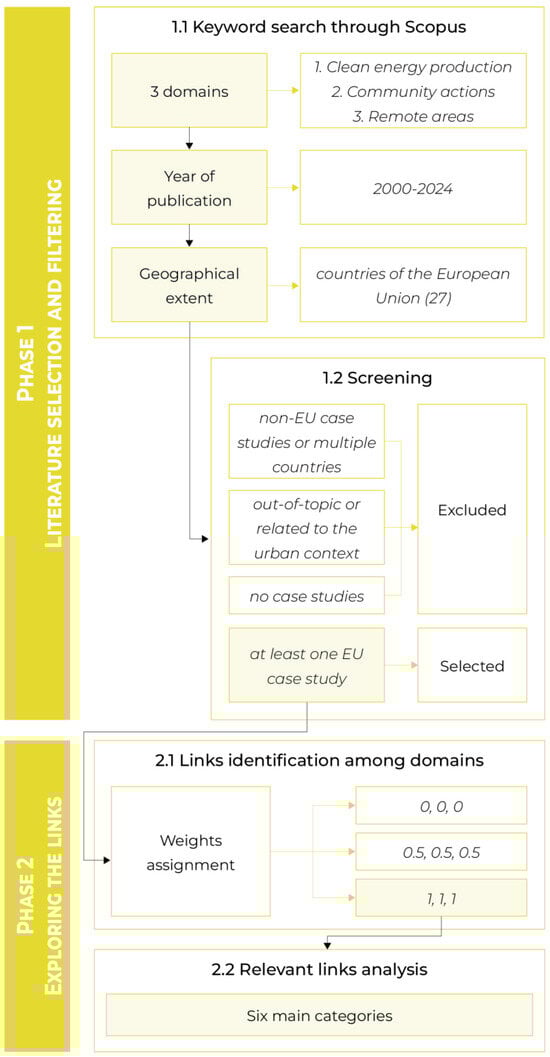 We structured the review starting from the PRISMA 2020 model [70] and organized it into two main phases and four steps, as illustrated in Figure 1. In response to the first research question, phase 1 aims to collect scientific papers related to the three domains (i.e., clean energy production, community actions, remote areas) and investigate which disciplines dealt with them, when, and where. To answer the second research question, phase 2 aims to develop a method for identifying real experiences in the UE that may represent best practices for building the targeted knowledge base. Finally, the results obtained from these two phases will be relevant to replying to the third research question.