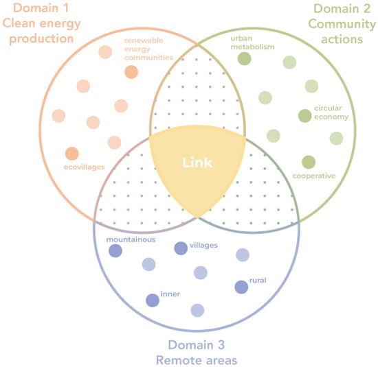 Figure 2 displays our focus on the three domains and the investigation of their links. We defined their meaning according to our research goal before starting with the keyword search. Recognizing that the quality of our lives depends on ‘a reliable supply of energy at an affordable price’ [71], we refer to the EU’s commitment to clean energy production to make it additionally sustainable and secure [72] in line with the REPowerEU actions [73]. Initiatives with this purpose include, for example, renewable energy communities and ecovillages.