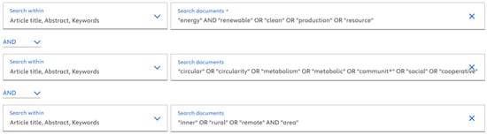 In the first string, we considered the domain of clean energy production, for which ‘energy’ was selected as the main term and associated with ‘clean’ and ‘production’, but also ‘renewable’ and ‘resource’. For the second string, we identified keywords based on the potential (already discussed in the Introduction section) of social and community-based actions, including those related to circular or urban metabolism approaches. In this sense, we chose ‘circular’, ‘circularity’, ‘metabolism’, ‘metabolic’, ‘communit*’, ‘social’, and ‘cooperative’. The third string refers to the localization of these actions, which, consistent with the research focus, is represented by all those territories somehow characterized by a certain degree of marginality. The final query applied to the article title, abstract and keywords is, thus, the following (Figure 3).