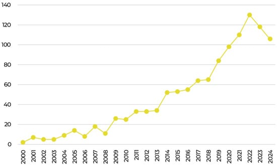 Year distribution of the number (absolute value) of published papers (period 2000–2024).
