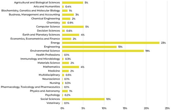 As Figure 6 shows, the publications are mainly derived from the subject areas of energy (23%), environmental science (19%), engineering (13%), and social sciences (10%). These data emerge from the analysis provided by Scopus on documents by subject area, which describes the subject category to which the source belongs. This means that several subject areas may appear for the same publication. Just to cite an example, the Journal of Applied Geography belongs to the following categories: Agricultural and Biological Sciences, Social Sciences, Environmental Science, and Business, Management and Accounting.