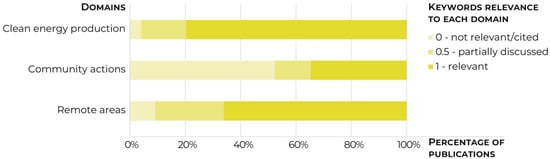 Moving on to the results of the weight assignment, Figure 8 displays the percentage distribution of publications according to keyword relevance for each domain. The domain with the highest number of publications showing relevant use of keywords to our goal is clean energy production. Indeed, it counts for 81% (n = 216) of the publications with weight 1—relevant. Remote areas follow, with 67% (n = 179). Community actions present the lowest percentage of publications with relevant use of keywords (35%, n = 94). Moreover, community actions are the least mentioned in the selected literature, as this domain is absent in 53% of the publications.