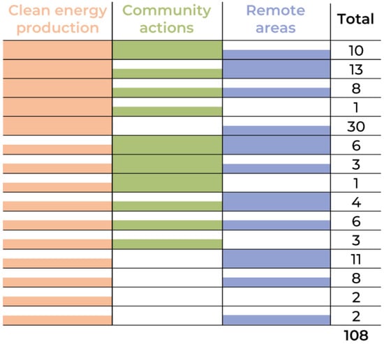 Moving to barriers and gaps, which is the less populated category, the publications identified difficulties, efforts, and constraints to achieve the targets for the energy transition and introduce renewable energies in rural areas to support their development, related to technological, digital, and human resources issues [78,111,112]. Two of the five publications argue the lack of ownership by the local community of energy or climate projects and plans [82,97].