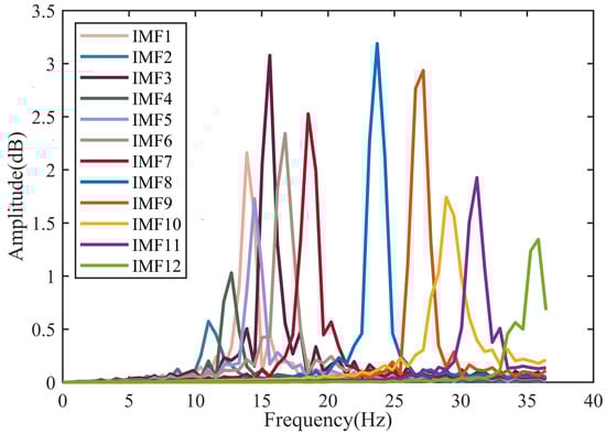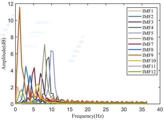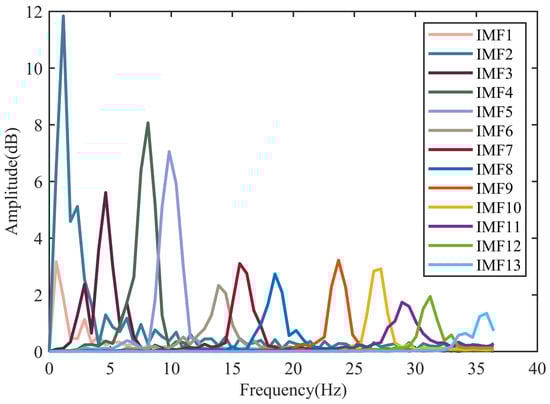 This article takes the typical voyage of the “Alsterwasser” cruise ship as an example, with historical data on its sailing load referenced from reference [24]. It uses Equations (2) and (3) to calculate the power of its HESS, then decomposes the power of the HESS. The optimized VMD parameters obtained from the first-time MVO-VMD and secondary MVO-VMD are shown in Table 2. The 13 components obtained from the preliminary decomposition are shown in Figure 3, and their spectral characteristics are illustrated in Figure 4. Based on the spectral characteristics of the initial decomposition results and the degree of mode mixing, these 13 components are divided into high-frequency and low-frequency groups. The low-frequency group obtained from the first decomposition undergoes a secondary decomposition, resulting in 12 components as shown in Figure 5. The spectral characteristics of these components are illustrated in Figure 6. Similarly, the high-frequency group obtained from the first decomposition undergoes a secondary decomposition to generate another set of 12 components as shown in Figure 7 with their spectral characteristics illustrated in Figure 8.
