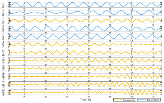 The results of the secondary decomposition exhibit significant mode overlap, as shown in Figure 6 and Figure 8. High-frequency and low-frequency components cluster together, making it complicated to accurately identify frequency boundary points based on modal mixing degrees. This can lead to inaccurate allocation results; for example, due to the indistinguishability of component frequencies caused by modal overlap, there is a risk of mistakenly allocating components that should be assigned to supercapacitors to lithium batteries instead. Such misallocation not only causes fluctuations in output power but also shortens the lifespan of lithium batteries due to excessive charging and discharging cycles, thereby increasing costs. Therefore, the power distribution after secondary decomposition cannot be determined by the degree of modal aliasing but is allocated to lithium batteries or supercapacitors based on the differences in the center frequencies of the components obtained from secondary decomposition [14]. Based on the central frequencies and degree of aliasing obtained from the components of secondary decomposition in Figure 6 and Figure 8, they are, respectively, assigned to lithium batteries and supercapacitors as illustrated in Figure 5 and Figure 7. The allocation results are presented in Table 4. The green curve in Figure 5 represents the lithium battery component, while the purple curve represents the supercapacitor component. In Figure 7, the blue curve indicates the lithium battery component, and the yellow curve indicates the supercapacitor component.