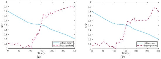 Based on the power curves mentioned above and the parameter settings for lithium batteries and supercapacitors in reference [23], we can obtain the SOC curves of lithium batteries and supercapacitors during a typical voyage of the “Alsterwasser” cruise ship, as shown in Figure 10.