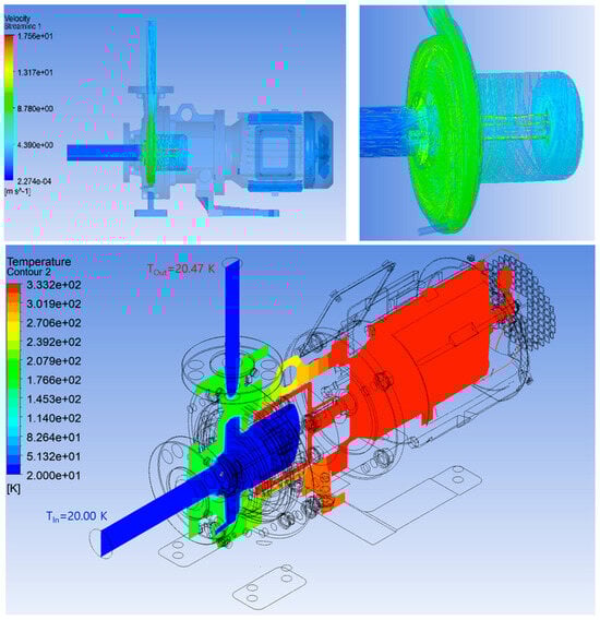 CHT analysis results under the condition of insulation Teflon layer thickness tTef = 4 mm: Temperature distribution of the pump and working fluid and streamline of the working fluid.