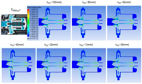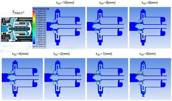 Changes in the entropy production rate () distribution due to the temperature fluctuation component of the working fluid in the pump according to changes in insulation thickness (tTef).