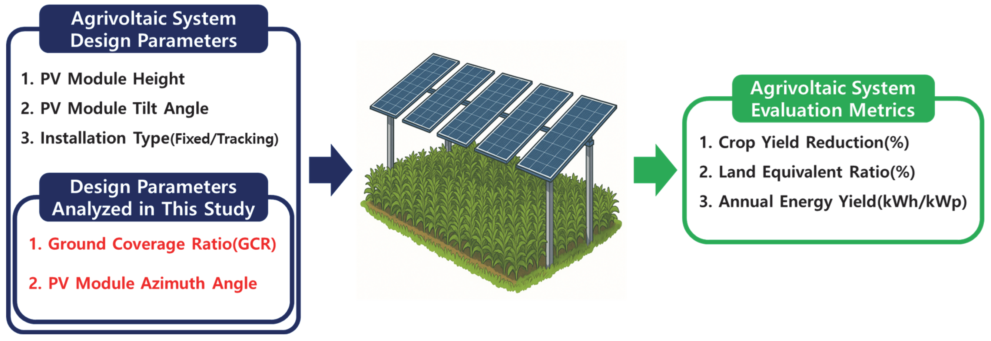 Figure 1 shows the major design parameters of APV systems and the design variables and performance evaluation metrics analyzed in this study. Key design parameters generally considered in APV system design include module height, module tilt angle, and installation type (fixed or tracking).