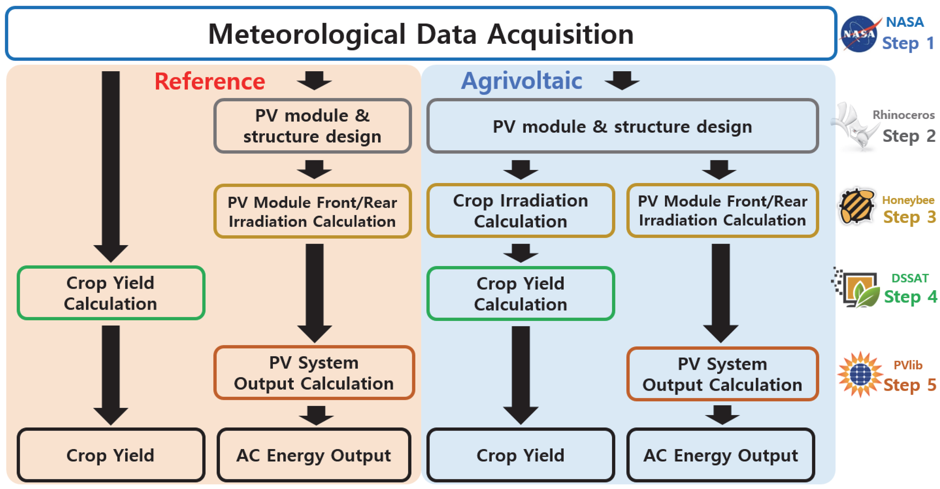 This study proposed a simulation framework to integrate the assessment of crop yield and electricity generation in APV systems. The proposed framework comprises five stages: meteorological data collection and processing, 3D modeling, irradiance simulation, crop yield simulation, and electricity generation simulation. Selecting GCR and PV module azimuth as key design variables for APV system design, simulations were performed for rice cultivation conditions in Gochang, Jeollabuk-do, Republic of Korea, yielding the following key conclusions: