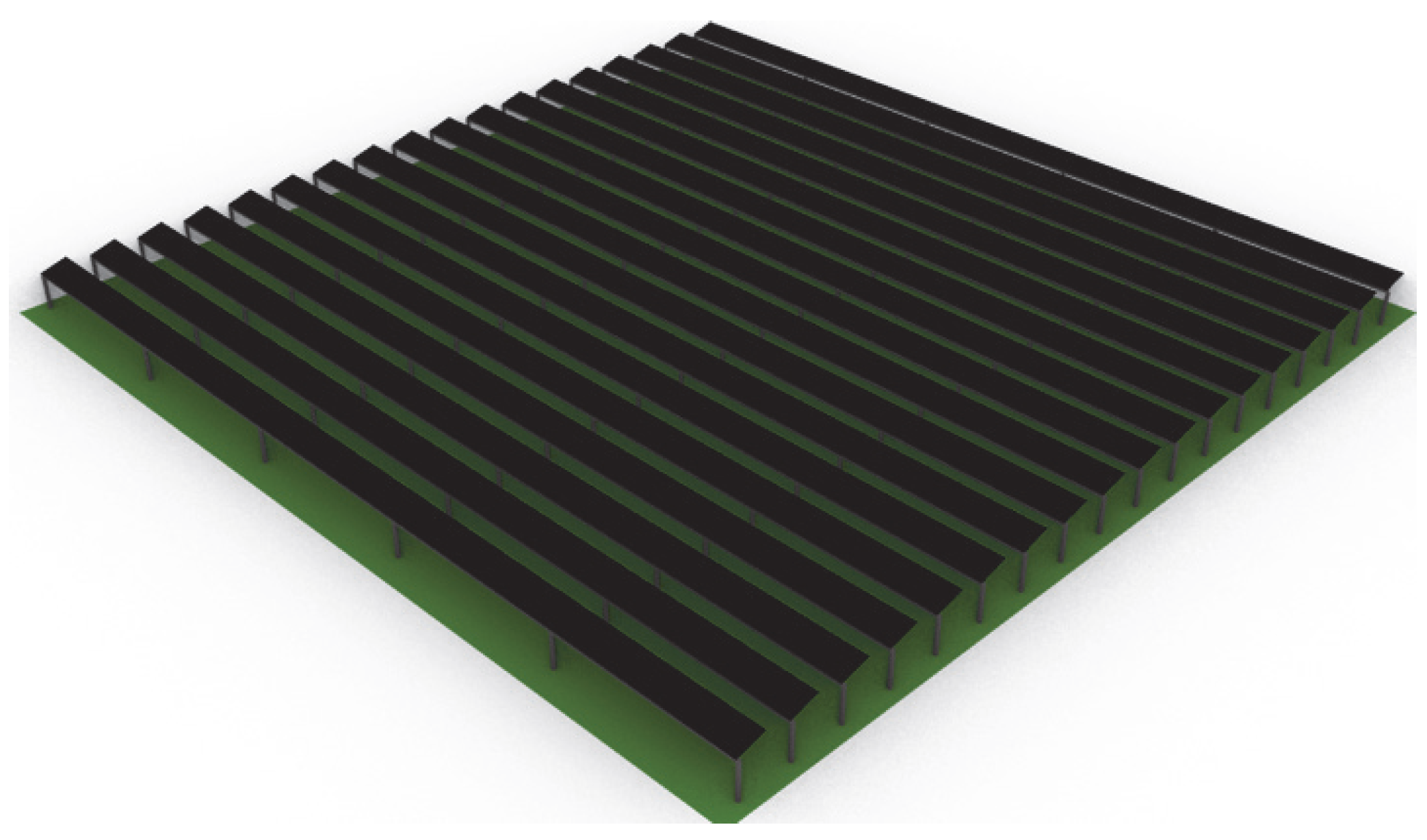 Figure 4 shows the 3D model of the reference conventional ground-mounted PV system, and