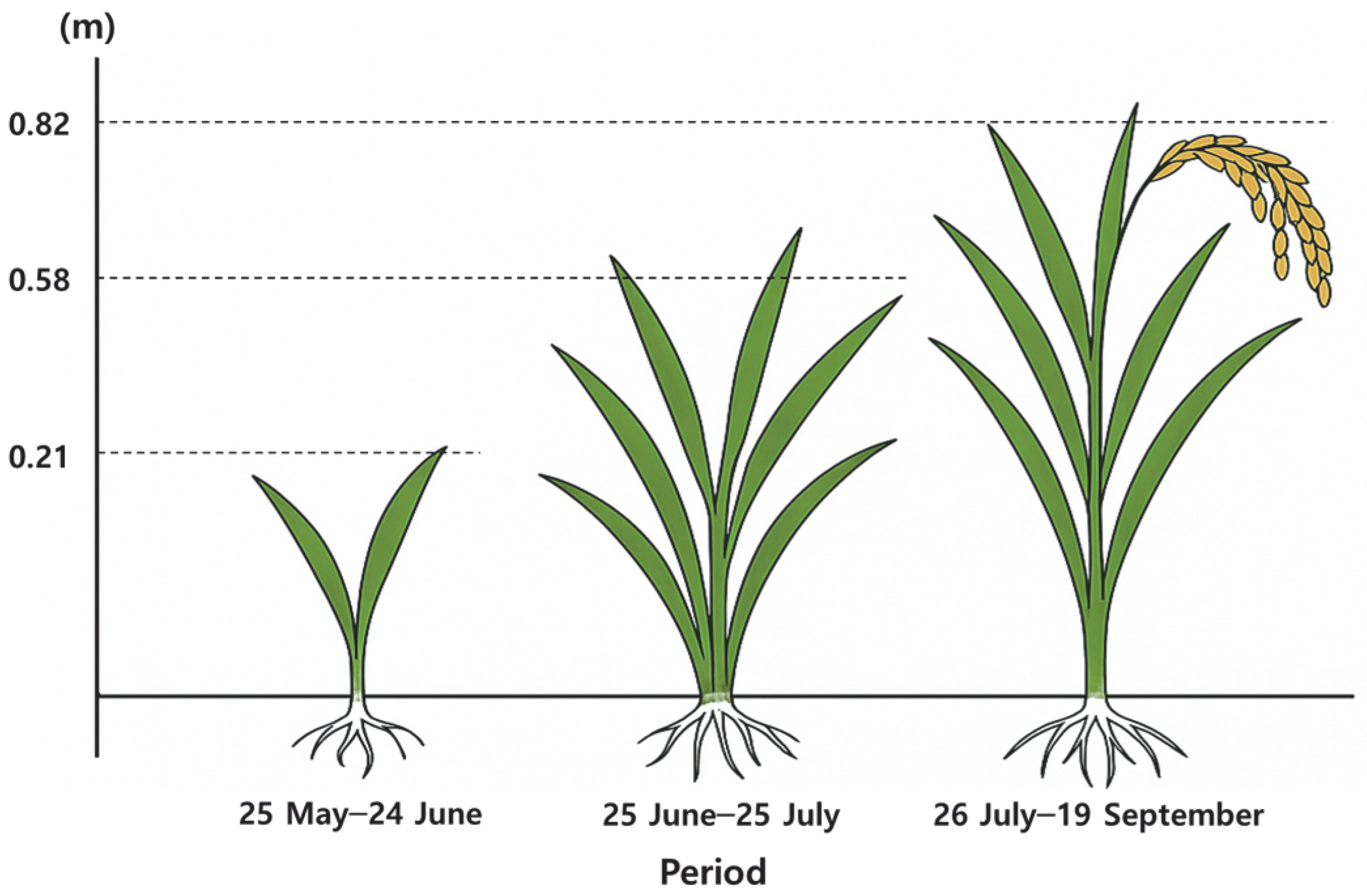 To analyze the spatial distribution characteristics of irradiance reaching crops beneath the APV system, irradiance simulations were performed considering height changes in rice plants across growth stages. Since rice plant height changes continuously during the growth process, the growing period was divided into five stages, with crop height reflected for each period in the simulations. From 1 January to 24 May 2023, during the pre-transplanting period, crop height was set at 0 m; from 25 May to 24 June, this was set at 0.21 m; from 25 June to 25 July, it was set at 0.58 m; from 26 July to 19 September, it was set at 0.82 m; and from 20 September to 31 December, after harvest, it was set again at 0 m. These height values were set based on rice crop height data at 30/60/90 days after transplanting [