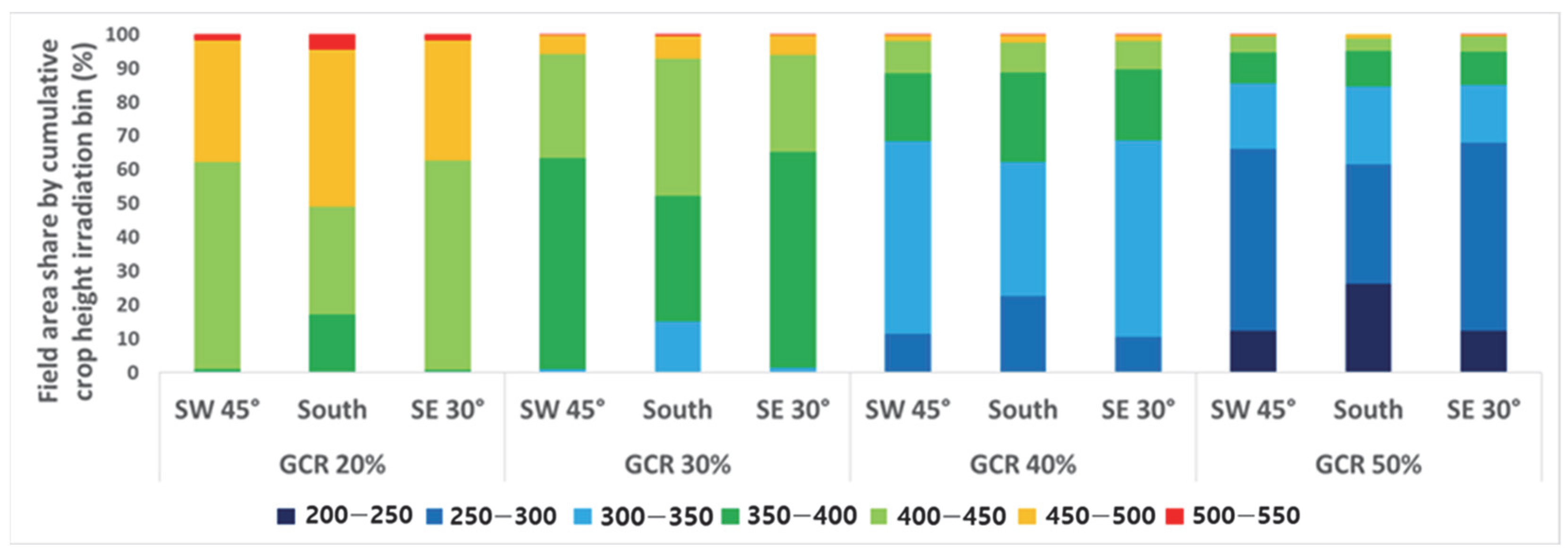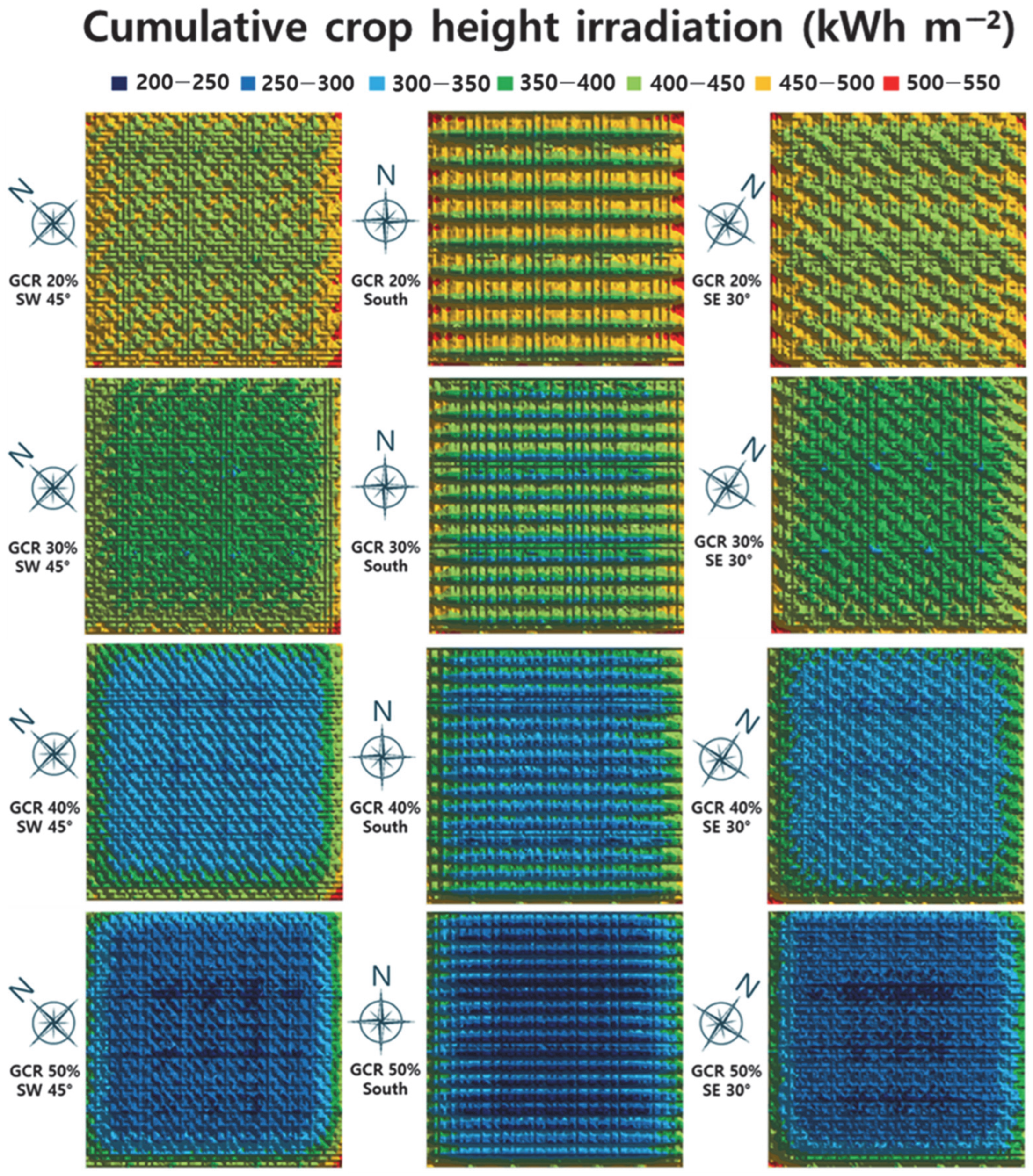 Simulations were performed for a total of 12 scenarios combining four GCR levels and three azimuth angles. Cumulative irradiation during the growing period was calculated at each virtual sensor.