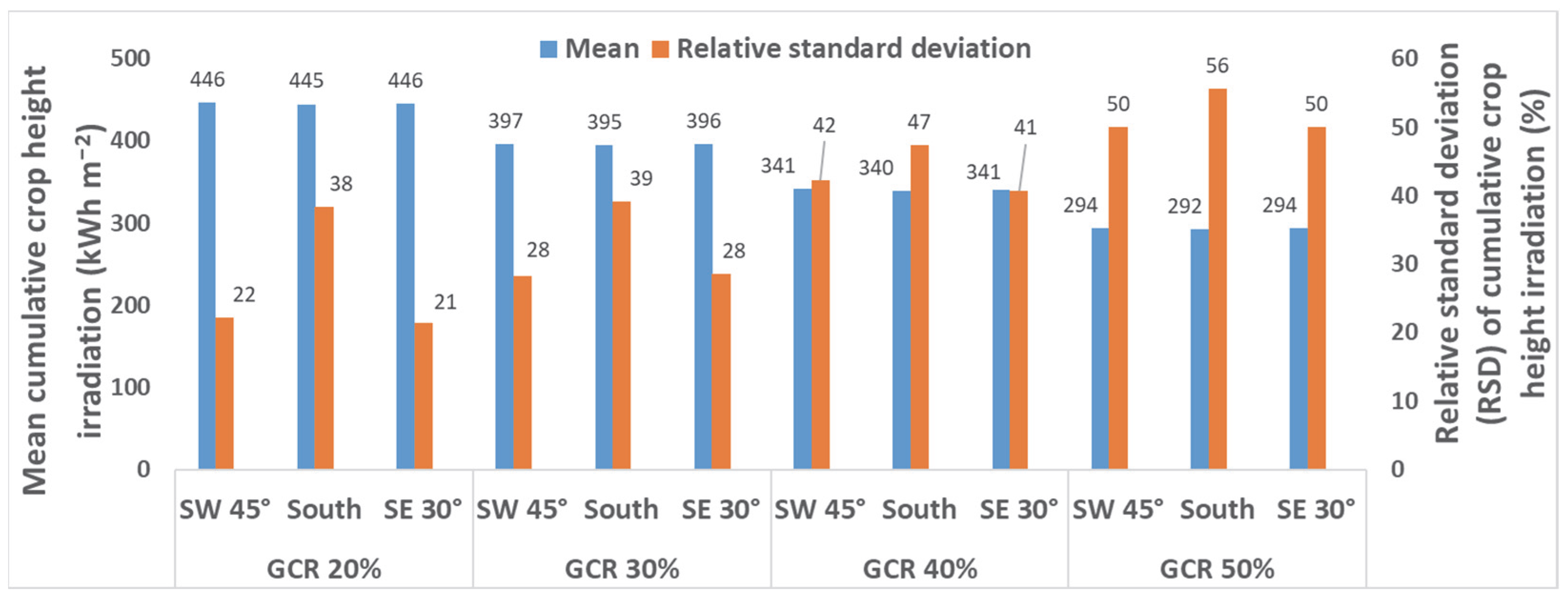 Figure 7 shows the mean cumulative crop irradiation and relative standard deviation by GCR and azimuth.