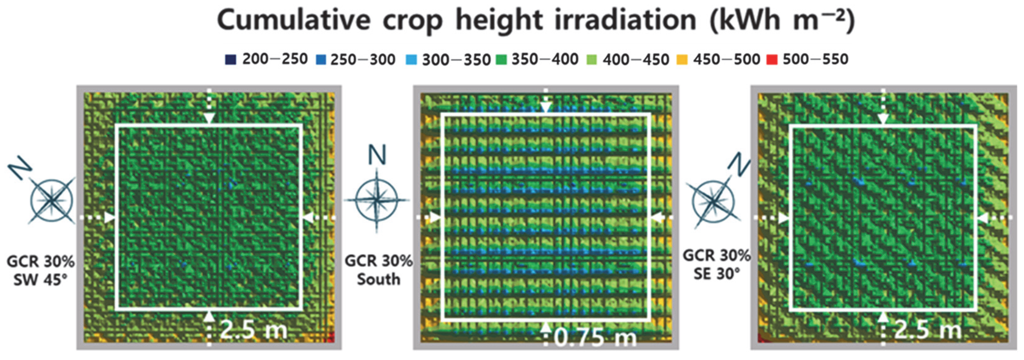 Analysis of irradiance distribution by GCR revealed a decreasing trend in mean cumulative irradiation across the farmland as GCR increased. At GCR 20%, mean cumulative irradiation was measured at 445–446 kWh m−2 regardless of PV array azimuth. As GCR increased to 30%, it decreased to 395–397 kWh m−2; at 40%, it decreased to 340–341 kWh m−2; and at 50%, it decreased to 292–294 kWh m−2, showing a sequential decline. Under the same GCR condition, when the PV array changed from due south to southeast or southwest, the difference in mean irradiation was minimal, within 1 kWh m−2.