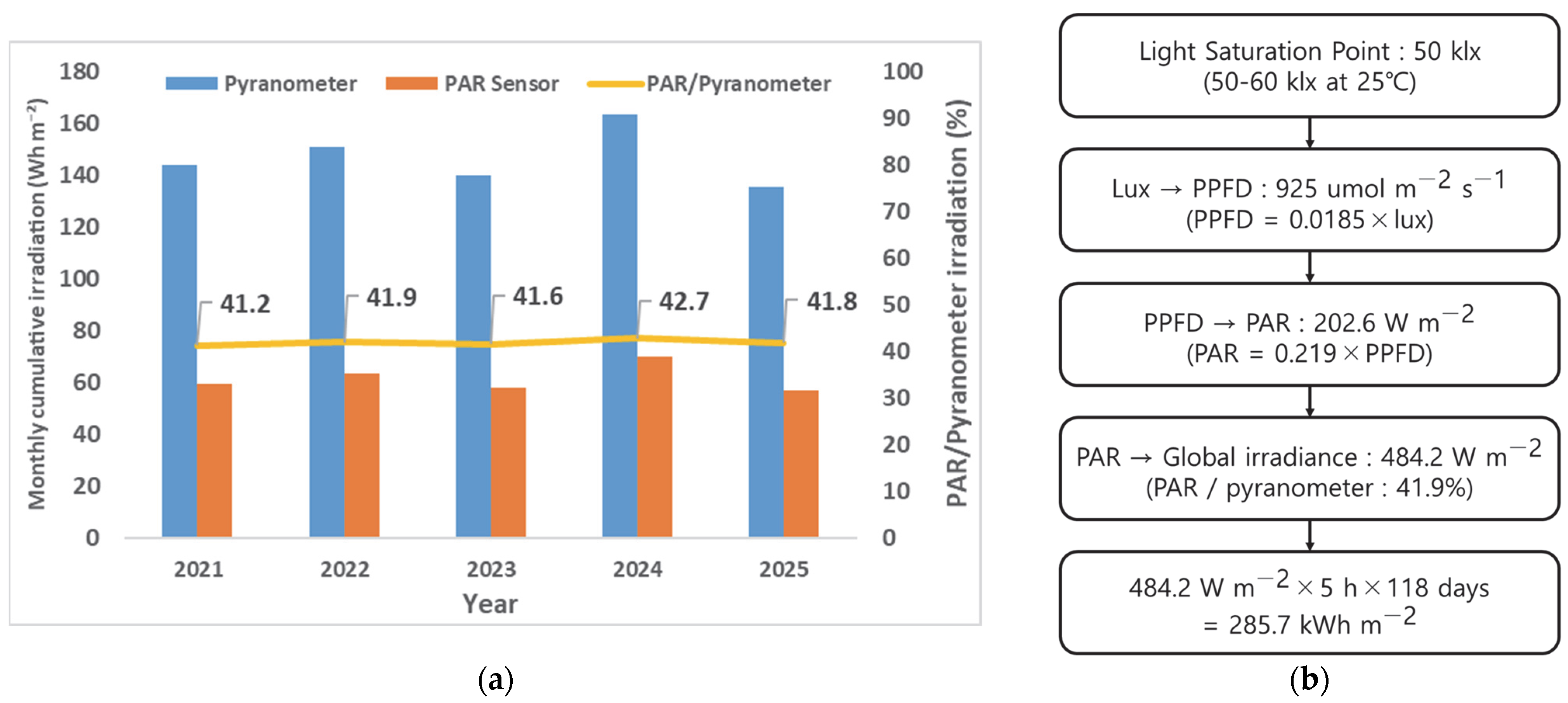 Figure 10a shows a comparison of monthly cumulative irradiation (pyranometer and PAR) and the PAR-to-pyranometer ratio for May–September 2021–2025, and (b) presents the conversion pathway (50 klx → PPFD → PAR → total irradiance).