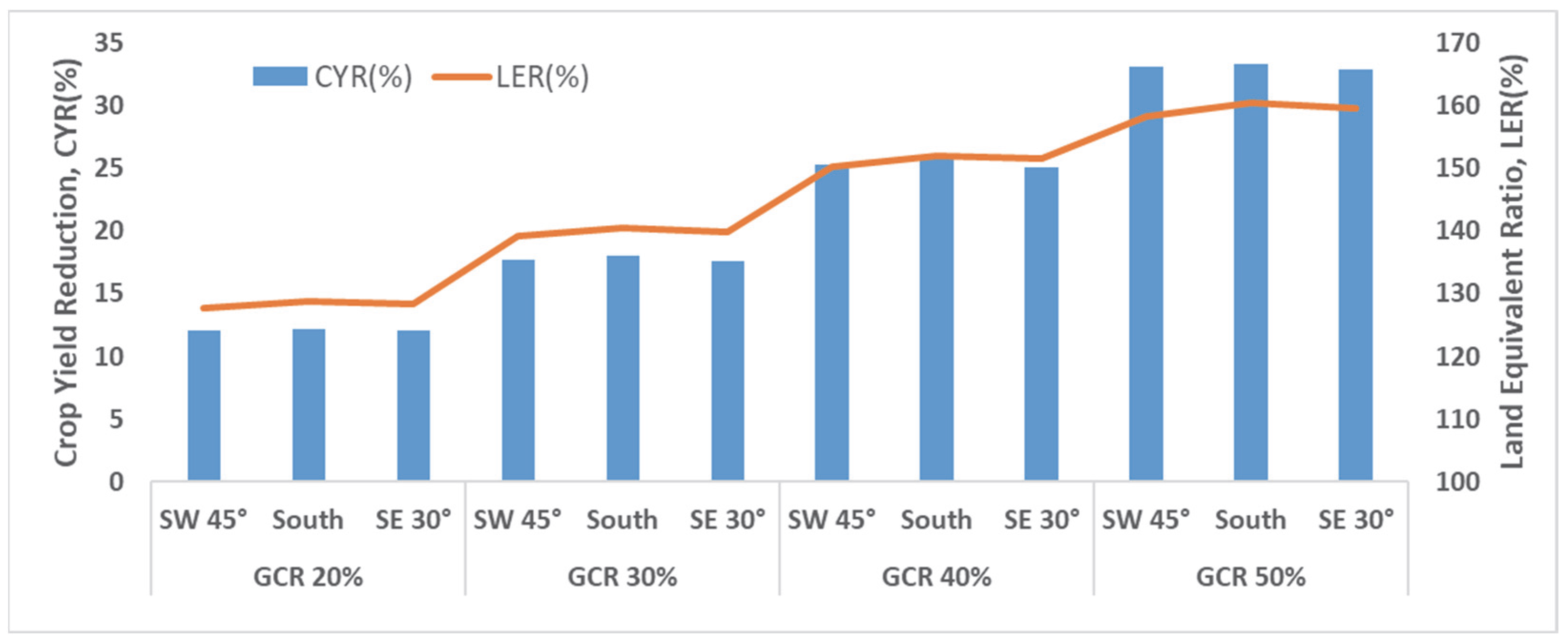 Section 3.3, the effect of azimuth change on mean irradiation is limited. For example, at GCR 30%, CYR was 17.7% for 45° southwest, 18.1% for due south, and 17.6% for 30° southeast, confirming that differences by azimuth are not substantial in practice.