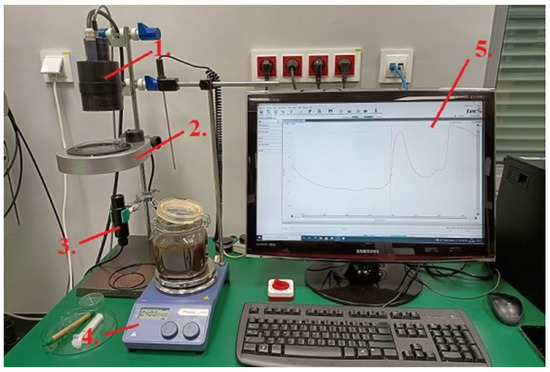 Research station for obtaining NIR spectra (1.—RP-7 probe, 2.—rotating table with Petri dish, 3.—A40 probe, 4.—magnetic stirrer, 5.—computer with software for recording the obtained spectra). [Source: own study].