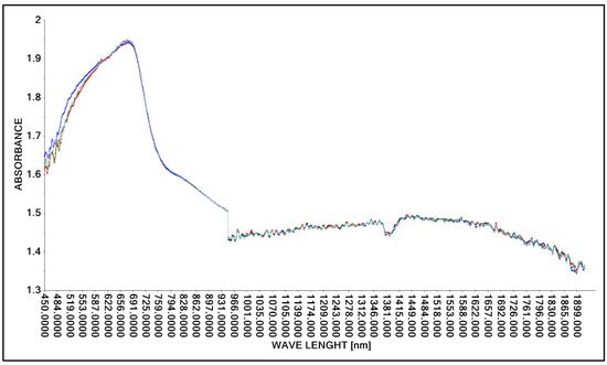 As in the case of tests using the Niron probe, the A40 probe was used to obtain spectral spectra of concentrated lactic acid. The test was repeated three times to verify the repeatability of the test method used. As in the case of scans obtained with the Niron probe, spectral spectra in the wavelength range of 450 nm to 1900 nm were obtained with the A40 probe (Figure 4).