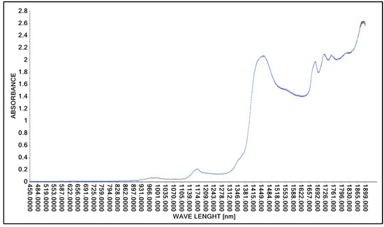 The research was designed to use transmission and reflection methods in the construction of spectral spectra of lactic acid. First, the task was specified, which was to demonstrate that it is possible to obtain spectral spectra of concentrated lactic acid for both methods, therefore Niron and A40 heads were used, which characterized both research methods. Three repetitions of the concentrated lactic acid scanning process were performed. The results of the study are presented graphically (Figure 3 and Figure 4). A spectral spectrum of concentrated lactic acid (ca. 90%, density 1.209 g·cm−3) was obtained using the Niron head. To achieve the objective of the study, a laboratory sample of lactic acid was prepared and scanned to obtain spectral patterns in the analyzed wavelength range (Figure 3).