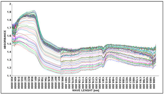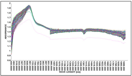 As in the case of studies involving the acquisition of spectral spectra for an aqueous solution of lactic acid and molasses using the Niron head, in the next research step, spectral spectra were acquired in the accepted range of lactic acid concentrations (Table 3) using the A40 head. The tests were performed for the full wavelength range, from 450 nm to 1900 nm (Figure 11).