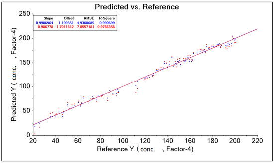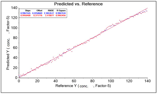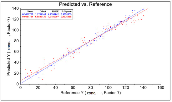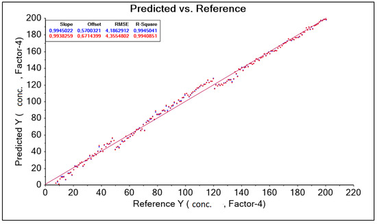 The result obtained was corrected by changing the wavelength range adopted in the form of a training data range. Among other things, the following were used: baseline transformation and data corrections for model construction by automatically (software) and intuitively (decision of the person operating the software) removing outliers. As a result, 13 model solutions were created, differing in the aforementioned data ranges (wavelength ranges) and model quality parameters such as: RMSE (root mean square error), R2 (coefficient of determination). The best model, called “PLS Niron 500–1850 nm without out manually 5” for the Niron head, was characterized by the parameter RMSE = 4.435 g·dm−3, parameter R2 = 0.985 (Figure 10, Table 6).