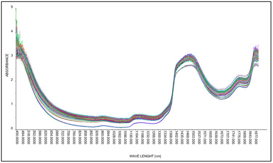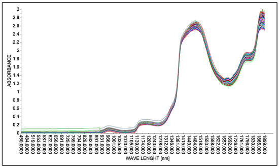 Based on the guidelines for changing the acid concentration in an aqueous solution (Table 2 and Table 3), the process of obtaining spectral spectra was carried out. In the first step, the possibility of obtaining spectral spectra for an aqueous solution of lactic acid was tested. The spectra obtained were in the wavelength range from 450 nm to 1900 nm. The spectral spectra for 146 analyzed samples of aqueous lactic acid solution are presented in graphical form (Figure 5).