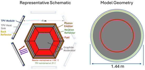 The radiantly integrated TPV–microreactor system is illustrated in the representative schematic in Figure 1. The basic configuration of the reactor core is a series of coaxial rings around a central graphite region that provides the structural backbone of the reactor and potential space for instrumentation and control equipment. Power is generated in the inner layers where fuel ring(s) are sandwiched between graphite layers. The heat is then conducted through a radial beryllium oxide reflector into a tungsten wrapper acting as cladding and emitter. This high-temperature emitter radiates across a low-pressure gap through black-body photons. Some of the radiative photons are captured by the TPV panels as useful electric power, while the majority of the sub-bandgap photons are reflected back to the core.