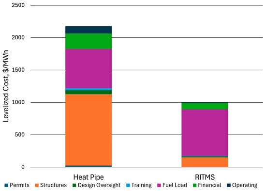 Based on the steady-state trade-off studies, a cost-optimized, single-fuel region design was selected [1]. Figure 2 presents a comparison of the account-specific contributions to levelized cost for the battery-style heat pipe reactor [4] and the optimized RITMS design. Driven largely by the reduction in system costs associated with heat exchangers, pumps, and turbines, and the extended operating time on LEU+ fuel, the selected RITMS design is able to compete with similarly sized units. For the purposes of the transient analysis, the optimized design and its steady-state operational parameters, as described in Table 1, are selected for the initial reference conditions of the model core. The model geometry in Table 1 is a properly scaled representation of the optimized design’s cylindrical geometry.