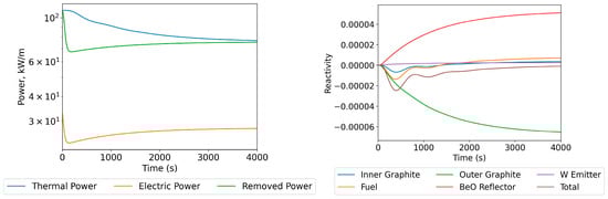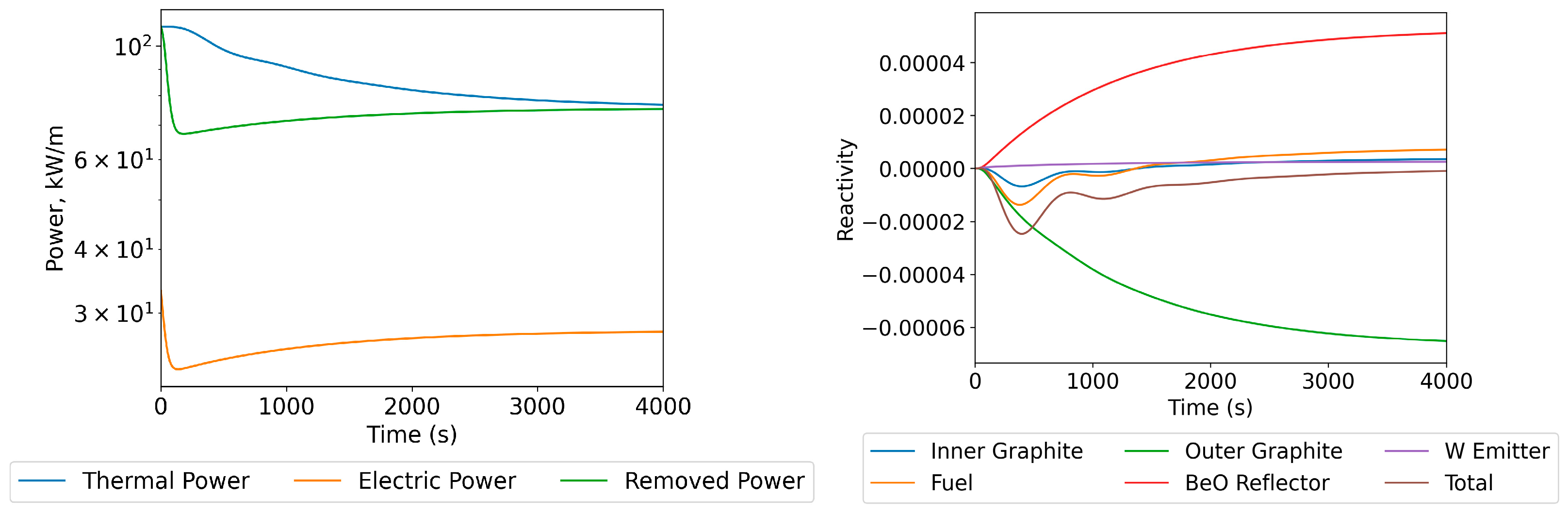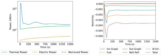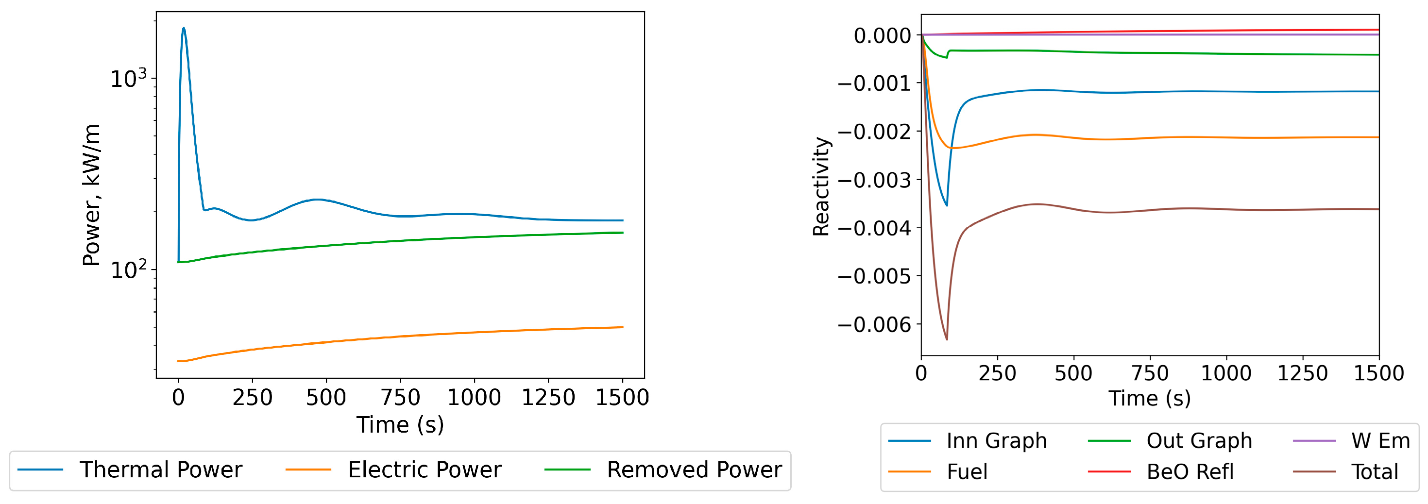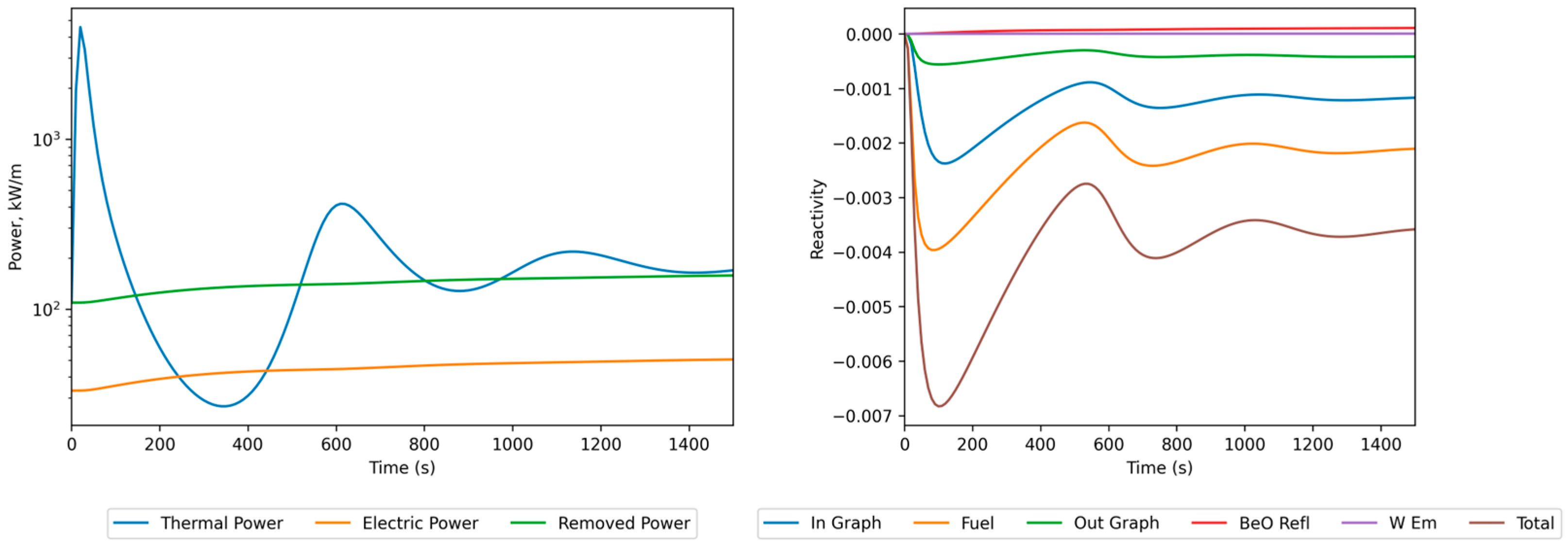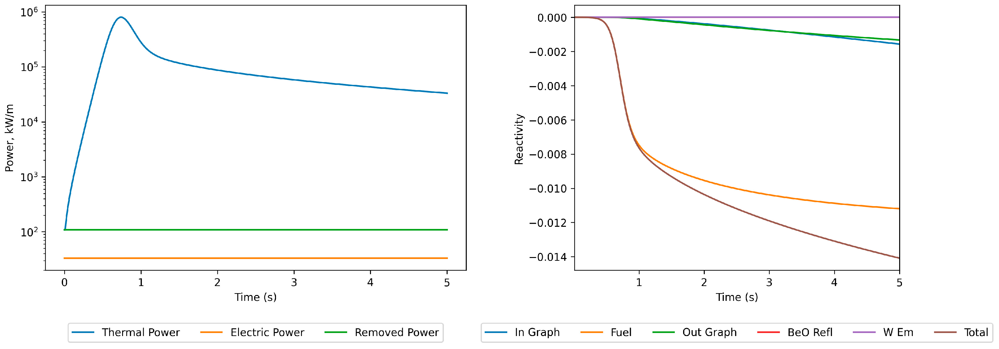 Figure 16. Power (left) and partial reactivities (right) as a function of time following a prompt positive reactivity insertion. Note that the reactivity of BeO (red) and W (purple) are practicality identical and very close to zero.