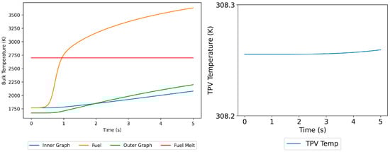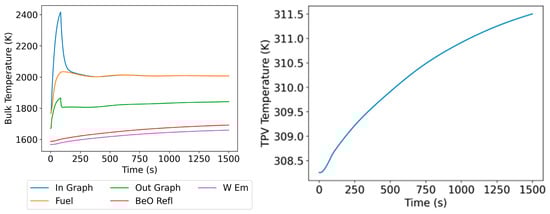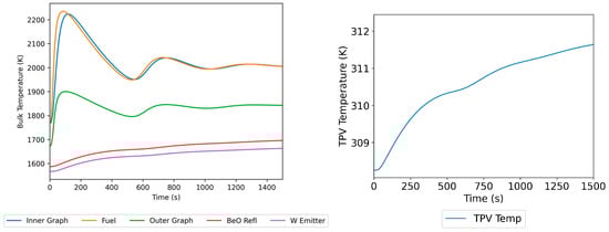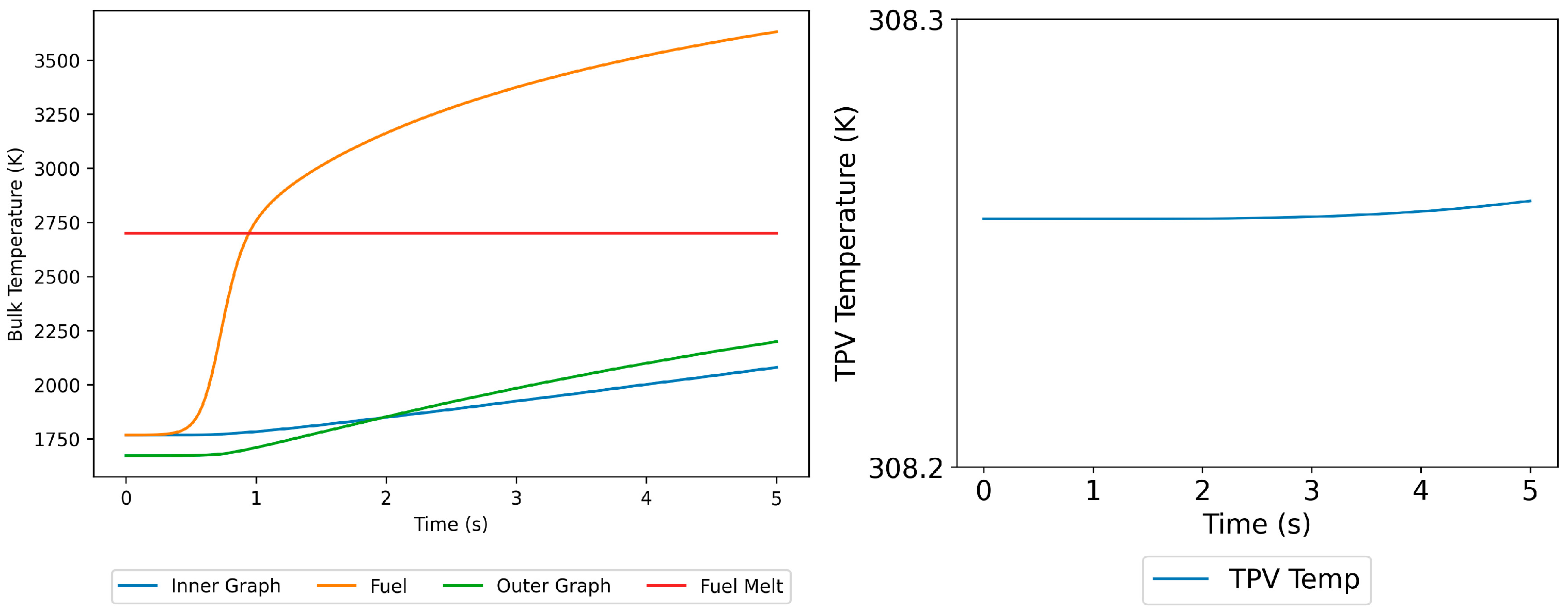 Figure 15. Core bulk temperatures (left) and TPV temperature (right) as a function of time following a prompt positive reactivity insertion.