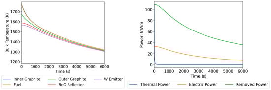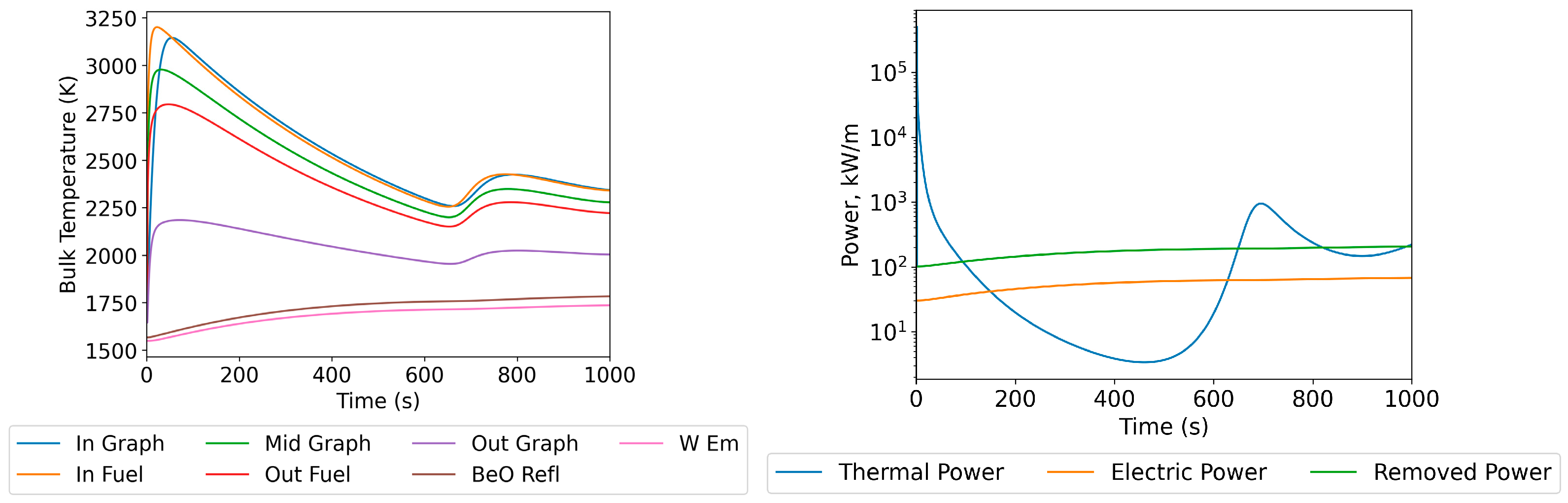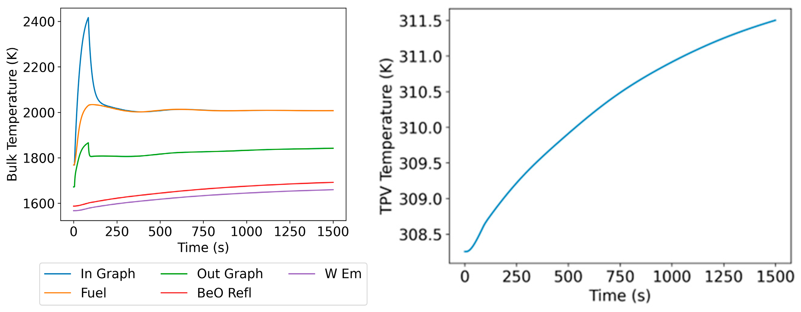 The first modeled peripheral incident covers a sudden loss of the low-pressure conditions within the radiative heat channel. It is useful to have an amount of gas between the emitter and TPV as it reduces the evaporation of tungsten and its deposition onto the panel surface, but to maximize the radiative heat transfer and thermal photon production, this density needs to be kept low. Either by inadvertently flushing the core of undesired gas product build-up or through a break in the unit vacuum chamber, this transient begins when a significant amount of atmospheric pressure gas is allowed to flood the radiative gap. This is captured by adding a convective term to the radiative heat removal boundary conditions. As presented in Figure 9 and Figure 10, the nearly doubling of the removed power at the core surface leads to a rapid decrease in the temperature of the tungsten emitter, BeO reflector, and outer graphite ring. The reduction in the radiative heat transfer to the TPV leads to both a drop in the TPV temperature and the power being converted into electricity. Meanwhile, there is a slight increase in the generated thermal core power, which is driven by the cooling of the graphite moderator. Overall, without interaction, the system reaches a new equilibrium.