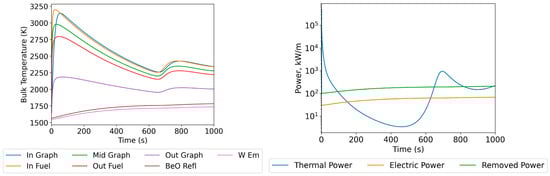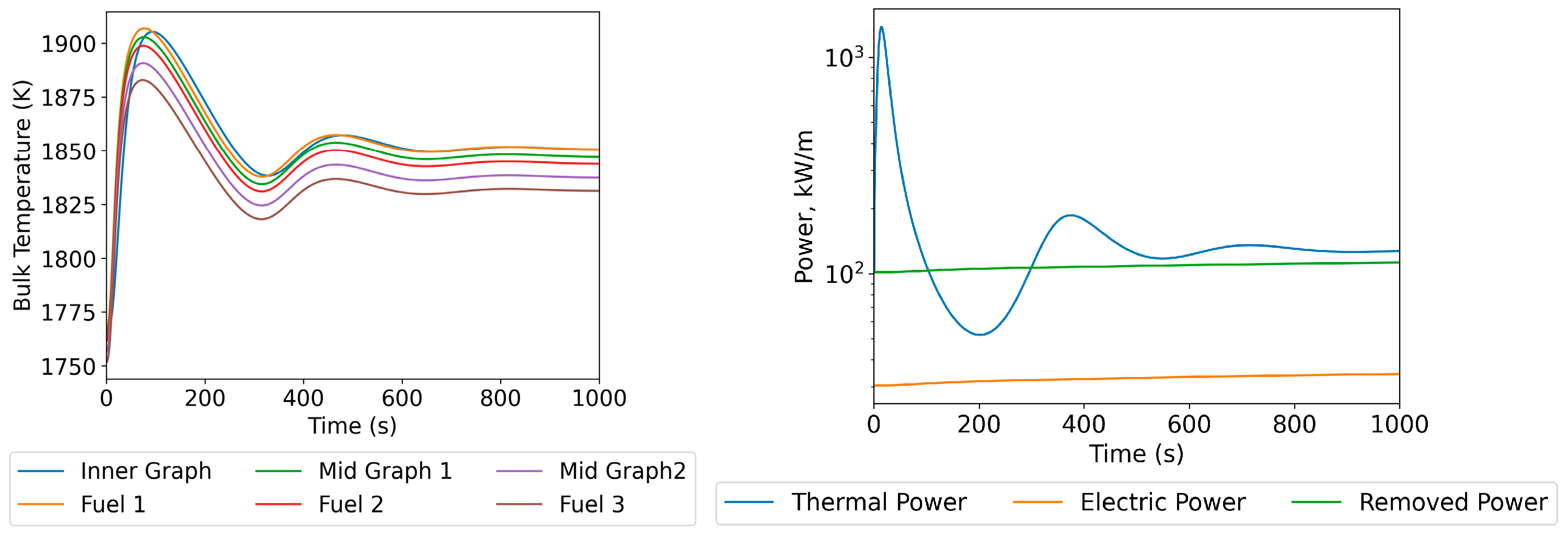 Figure 18. Core bulk temperatures (left) and power (right) as a function of time following a large negative reactivity insertion. Note that the temperature in the fuel (orange) and inner graphite (blue) match closely.