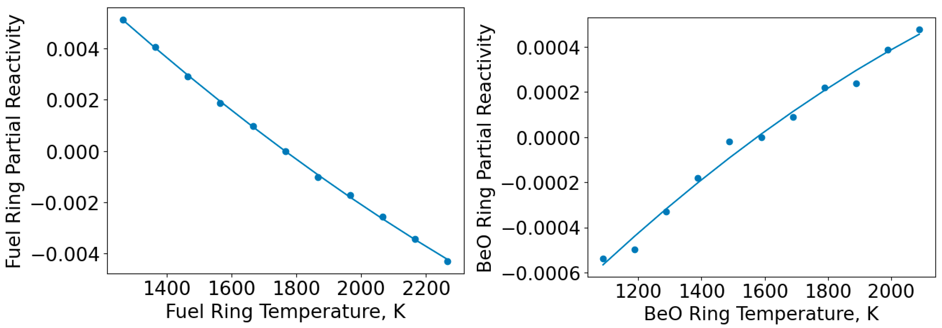 These coefficients were calculated for each ring based on a direct perturbation method. Serpent v2.2.1, which is a three-dimensional, continuous-energy Monte Carlo particle transport code developed at VTT Technical Research Centre of Finland, Ltd. (Espoo, Finland), can be utilized to calculate the eigenvalues for a given material, geometry, and temperature description [8]. For the design described in Table 1, a 2D Serpent model was created for the cylindrical geometry, utilizing the average ring temperatures of the design operating during steady-state conditions. Conducting a criticality run utilizing 100,000 particles, for 40 inactive and 100 active cycles, Serpent provided the reference reactivity with an error of less than 20 pcm. For this reference scenario, the temperature in each ring was parametrically varied up and down from 500 K at 100 K intervals. From the set of Serpent executions, the partial reactivity in each ring can be plotted against the ring temperature. These runs were conducted utilizing the temperature and energy-dependent ENDF/B-VII cross-section library. These partial reactivities were fitted to a second-order polynomial; from there, the TRCs could be derived according to Equation (3). Figure 4 presents the partial reactivity results and fitted curve for the fuel region and the BeO reflector region, as these have the greatest negative and positive feedback effects, respectively. The derived temperature-dependent reactivity feedback equations are provided in Table 3.