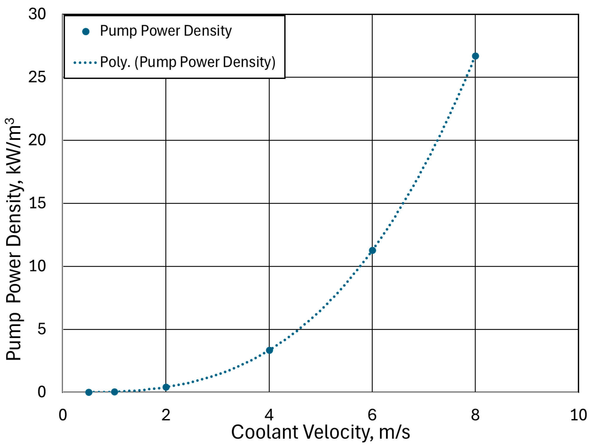 For the highest fidelity model, the pumping power, normalized to unit surface area, would be described as the amount of work needed to overcome the pressure changes within the channels due to friction losses and a change in flow area. A full description, as utilized in Li et al., 2021 [19], would require proper hydraulic treatment of the flow, but for simplicity’s sake, it is possible to generate a generalized approximation for the pumping power in terms of flow velocity, v [m/s], utilizing that study’s results. Figure 5 presents the pump power density and coolant velocity results, and the third-order approximation is presented in Equation (16):