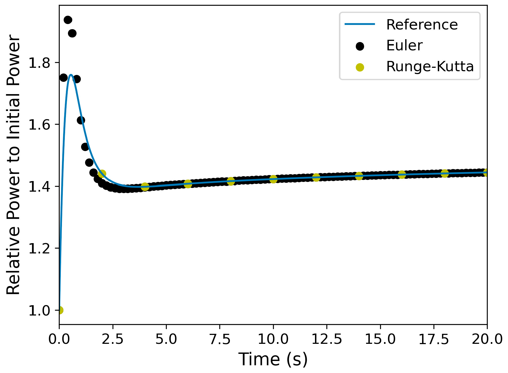 The solution to the first transient validation problem was calculated utilizing the system of ODEs for both the Euler method and RK5 method of calculation. For the Euler method, the largest step size that did not result in non-realizable solutions was 0.2 s and is presented below. Meanwhile, the RK5 method was applied utilizing a step size of 2 s. While the RK5 method evaluates the derivatives five times per step in comparison to the Euler method, which does so once, using the RK5 is twice as computationally efficient. Figure 6 and Figure 7 present the behaviors of the test problem following the initial transient incident. A reference solution was calculated utilizing the Euler approximation and a step size of 10−5 s. With the insertion of reactivity, there is a sudden rise in power which rapidly increases the temperature of the fuel and moderator regions. As these increase, the negative reactivity coefficients drive down the power and the system approaches a new equilibrium for power and temperature, which arises both when the reactivity insertion is offset and when the removed power is equivalent to the generated power. Figure 6 presents the behaviors of the fuel temperature with time and the variance between the applied solution method and the reference. These figures illustrate that the ODEs within our model capture the underlying physics of the transient and that the RK5 solution provides a more accurate approximation of the temperatures despite using 10 × fewer time steps. This is due to the significant overestimation of the power jump using the Euler method, as presented in Figure 7.
