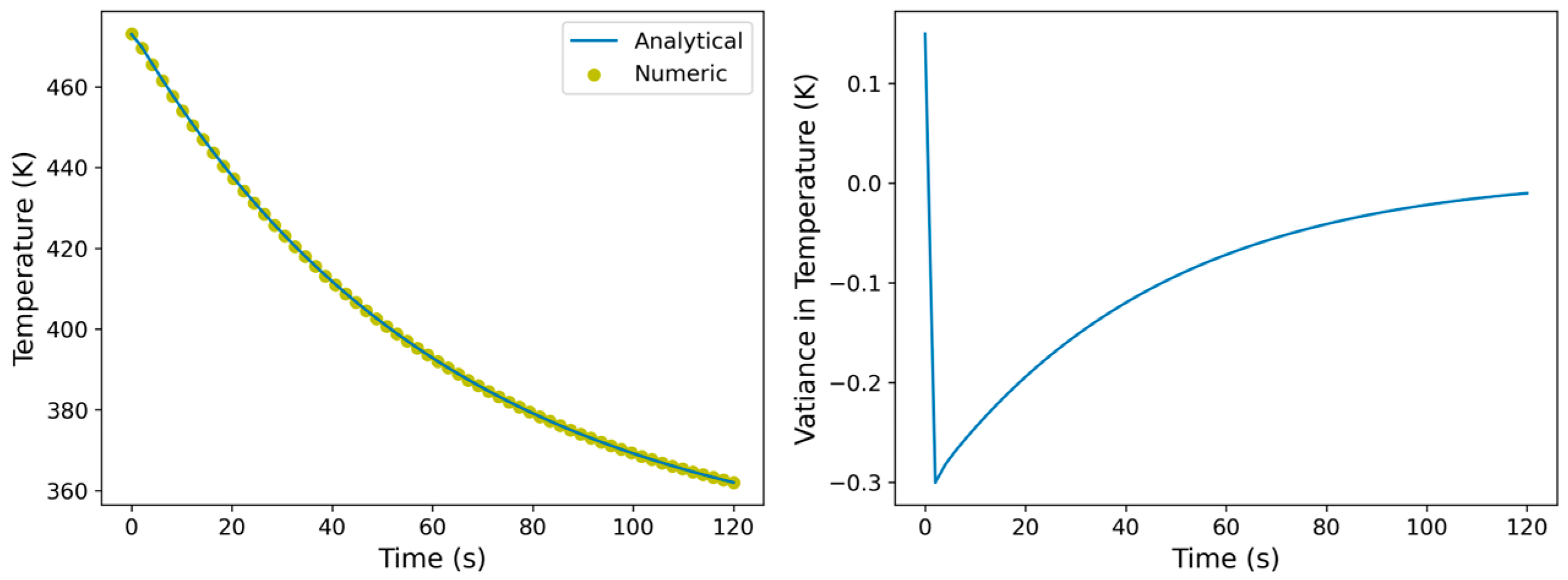 With the thermal feedback and point kinetics capabilities demonstrated, and the radiative solver recycled from the steady state, it is necessary to demonstrate the adequacy of the spatial conduction problem with time-dependent boundary conditions. For this purpose, a second validation problem was selected from the work of Holman (1983), which presents an analytical solution to the time-dependent conduction-convection problem [21]. A heated of uniform temperature and infinite height is suddenly exposed to a convective environment with cooler bulk temperatures. The properties of this problem are provided in Table 7. For a semi-infinite cylinder of uniform property and initial temperature that is being convectively cooled, an analytical solution for the temperature at a given radius and time, T r , t , is described by Equation (17) [22]: