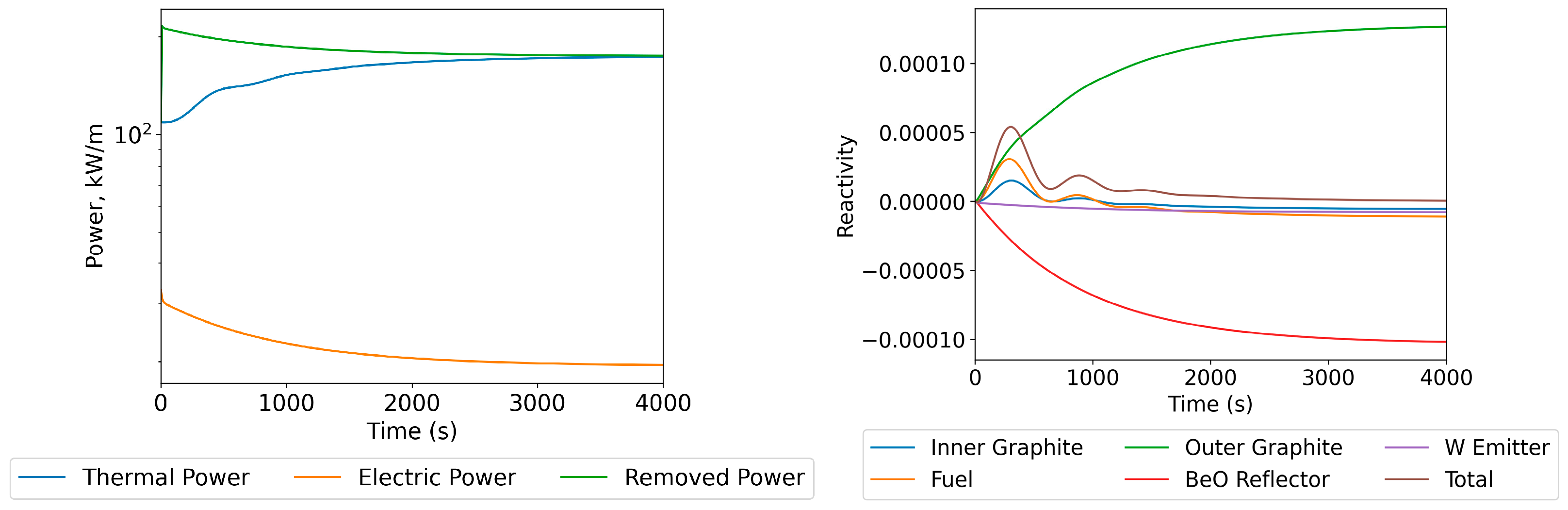 Some of the transient scenarios envisioned in this paper are easy to derive from the base nature of the RITMS design. Changes in heat removal at the TPV substrate and the introduction of convective flow at the reactor boundary have a greater certainty than those associated with still undesigned dynamic components. While it is out of this paper’s scope to explicitly model the reactivity control elements and TPV panel mechanisms, it is possible to make approximations that produce useful results. Several potential control mechanisms have been discussed, including the use of control rods in the interior graphite, drums [23] within the outer graphite, or designing the BeO reflector to move [24]. Regardless of the mechanism, it is assumed that the reactivity worth of the control system will be designed to compensate for the reactivity differential between the hot and cold cores and between fresh and depleted cores, with an additional margin to allow for power control. This would mean that in steady-state operations, there will be an amount of excess positive and negative reactivity that can be intentionally or accidentally inserted, external to reactivity feedback mechanisms.