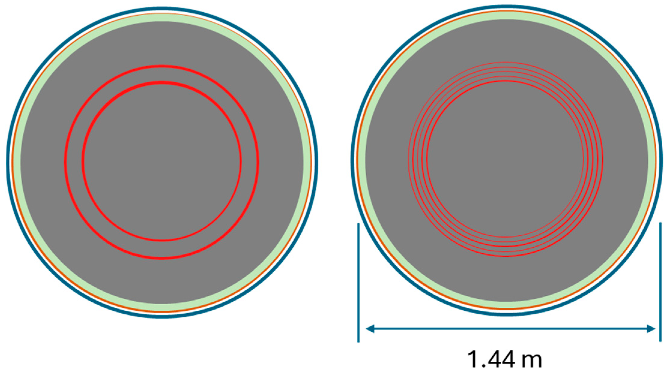 Figure 19. Radial layouts for the two-fuel-ring and five-fuel-ring RITMS designs. The fuel rings are denoted by the red color.