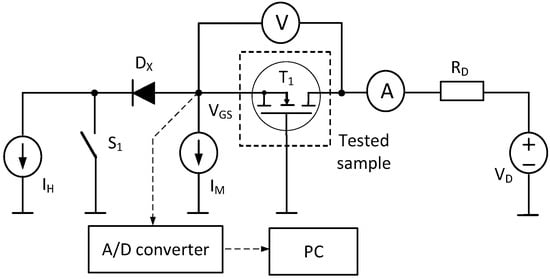 The VGS(t) voltage waveform is recorded using the A/D converter module and a PC. A voltmeter and an ammeter are used to measure the VDS voltage and IH current during the heating of the tested transistor. Switch S1 is closed during calibration and cooling of the transistor and open during the heating period.