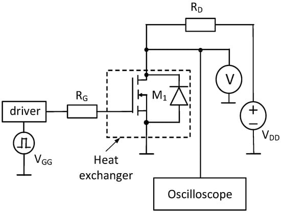 The set-up shown in Figure 2 includes the tested transistor M1 operating in a switching system with a resistive load RD. The drain circuit is powered by a VDD power supply operating as a current source of the value 50 A (when the tested transistor is turned on) or a DC voltage source of the value 10 V (when the transistor is turned off). Voltage source VDD is realized by parallel connecting the power supply GWInstek PSB-2800LS (Good Will Instrument Co., New Taipei City, Taiwan) with booster GWInstek PSB-2800L (Good Will Instrument Co., New Taipei City, Taiwan). The transistor gate is controlled by a rectangular pulse train from the VGG function generator of the type Rigol DG1022 (RIGOL Technologies, Co., Suzhou New District, China) via the gate driver IR2125 (Infineon Technologies AG, Neubiberg, Germany) and the resistor RG of the resistance 220 Ω to reduce the time derivative of the gate current.