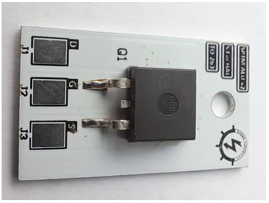 The IPB090N06N3G (Infineon Technologies AG, Neubiberg, Germany) power MOSFET manufactured by Infineon was selected for testing. This transistor belongs to the OptiMOS3 power transistor family, designed for use in synchronous rectifiers, controllers, and switched-mode power supplies. According to the manufacturer’s data [30], this transistor has a maximum allowable VDS voltage of 60 V and a maximum allowable drain current ID of 50 A. The RON resistance for this transistor is 9 mΩ. This resistance value increases by 50% with a temperature increase of 100 °C. The permissible power at a case temperature of 25 °C is 71 W, but at a temperature of 70 °C it decreases to 60 W. The thermal resistance of the tested transistor between the junction and the case does not exceed 1.6 K/W [30].