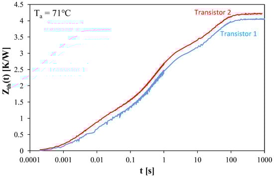 Zth(t) waveforms of four identical samples were measured. The results obtained for individual transistors differ from each other by no more than 5%. As an example, Figure 4 shows the measured Zth(t) waveforms for two of the tested transistors for which the largest differences in these waveforms were observed.