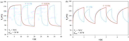 Figure 7 shows the waveforms of the temperature Tj in the steady state obtained for 4 frequency values with a rectangular power waveform of pmax = 30 W.