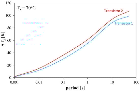 As can be seen, the period of the power waveform strongly affects the value of ΔTj. An increase in the period value from 10 ms to 50 s results in an even seven-fold increase in the value of ΔTj. The curve corresponding to the Transistor 2 transistor lies higher than the curve corresponding to the Transistor 1 transistor, because the values of the thermal time constants for the Transistor 2 transistor are lower. It is worth emphasizing that for all values of the period, an identical average value of the Tj temperature was obtained. The obtained nature of the relationship presented in Figure 8 indicates that operation at higher frequency values (smaller period values) should result in less exposure of the considered transistor to damage due to smaller fluctuations in its junction temperature.