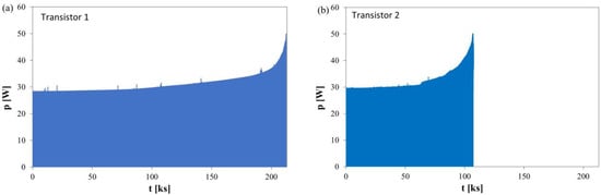 For example, Figure 10 shows the measured waveforms of power dissipated in the tested transistors operating at different frequencies from the start of the test until their failure. Figure 10a concerns the transistor operating at a frequency of 0.05 Hz, and Figure 10b, at a frequency of 0.1 Hz.