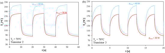 Using the thermal model shown in Figure 6, the waveforms of temperature of the most important heat flow path elements were determined when the tested transistor was excited with a rectangular pulses train with a minimum value of 0 and selected maximum values pmax. The computations were performed at a fixed coolant temperature of Ta = 70 °C.